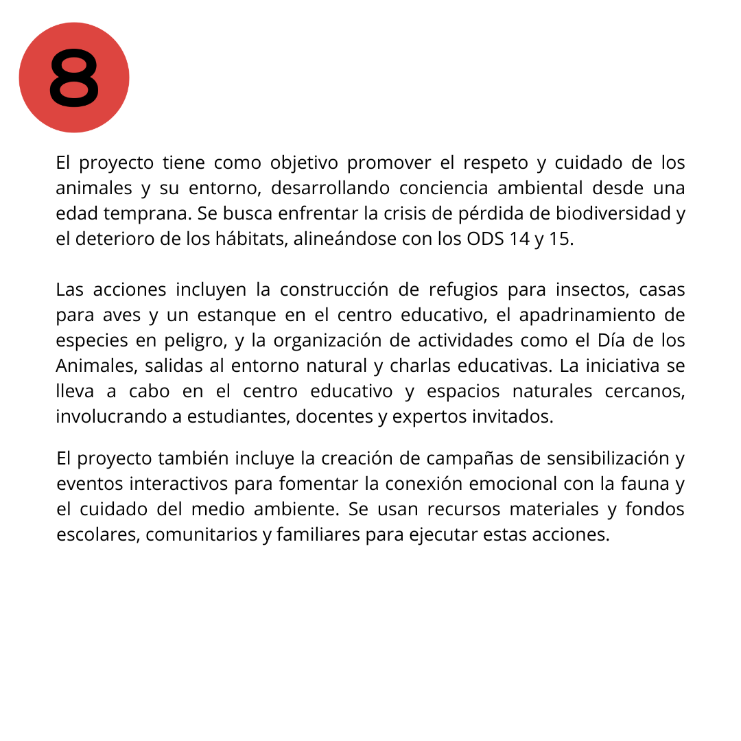 Se busca implementar un programa educativo y ambiental para promover el respeto, la protección y el cuidado de los animales y su entorno, fomentando una conciencia ambiental y un vínculo emocional con la fauna local y global. Este proyecto incluye actividades prácticas, campañas de sensibilización y la creación de espacios que apoyen la biodiversidad.